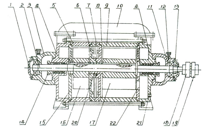 1、后軸承壓蓋 2、軸 3、軸承架 4、前后端蓋 5、短泵體 6、中間壁(B) 7、中間壁(A) 8、拉緊螺栓 9、長泵體 10、連通管 11、調(diào)整墊 12、油杯 13、前軸承壓蓋 14、填料壓蓋 15、后蓋園盤 16、短葉輪 17、長葉輪 18、泵聯(lián)軸器 19、電機聯(lián)軸器 20、軸套 21、進水孔 22、前蓋園盤